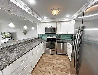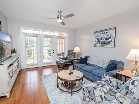 This light and bright ground-floor unit is three bedrooms, two baths with fully-equipped quartz kitchen (all dishware and kitchen gadgets included), new dining room set, living room with recliner and agronomical chair/ottoman plus utility room with full-size washer/dryer. Its private Southern exposure screened patio overlooks the serene pool and community pond, complete with fountain and walking path. This unit is nicely decorated with relaxing blues and greys having all of the appointments to make you feel at home, including flatscreen HDTVs in all bedrooms and living room. FREE WiFi is available in the unit and at the clubhouse/pool too! Extras Included: -Electric up to $150/mo. Within easy walking distance to bars and restaurants, 5-minute drive to the Historic downtown area and only 45 minutes to the airport. Prefer 1 year lease. Call for other options.